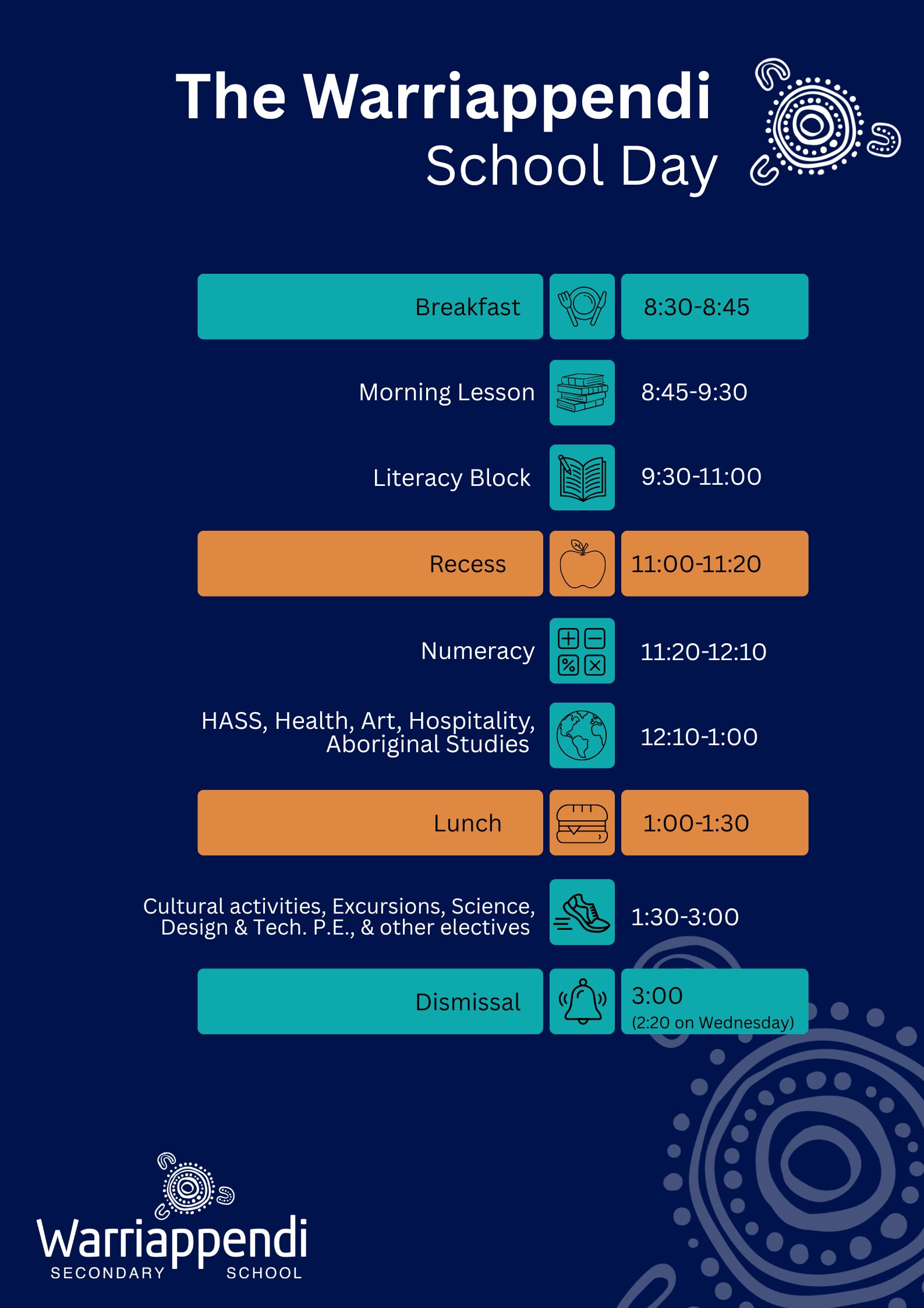 - From 11:20-1:00 students move through a range of subjects including Numeracy, HASS, Health, Art, Hospitality and Aboriginal Studies.